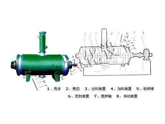 被干燥物料从壳体上方正中间加入,在不断正反转动的耙齿的搅拌下,物料轴向来回走动,与壳体内壁接触的表面不断换新,受到蒸汽的间接加热,耙齿的均匀搅拌,粉碎棒的粉碎,使物料内的水份气化,在真空系统的作用下,使被干燥物料内部水份和表面水份有利的排出,气化的水份经干式除尘器、湿式除尘器、冷凝器,从真空泵出口处放空。