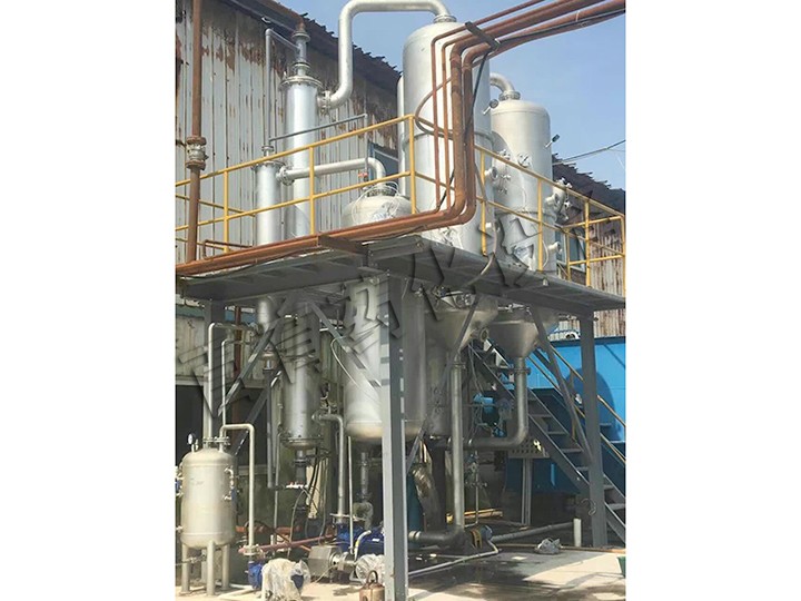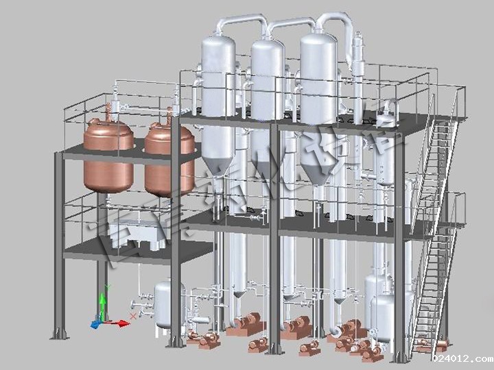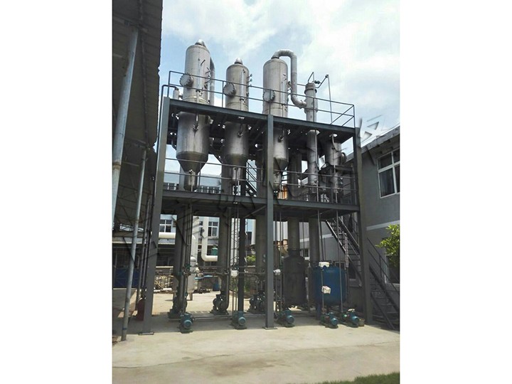 三效强制循环蒸发器用于免除在加热面上沸腾的产品而形成结垢或产生结晶。为此,管中的流动速度定要高。当液体流过热交换器时被加热,然后在分离器的压力减低时部分蒸发,从而将液体冷却至对应该压力下的沸点温度。