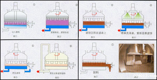 图⑦:经过搅拌器在卸料方向的旋转和同时的下降运动,搅拌器刮铲一层一层地顺序将滤饼刮出,滤饼可从卸料口自动出料。